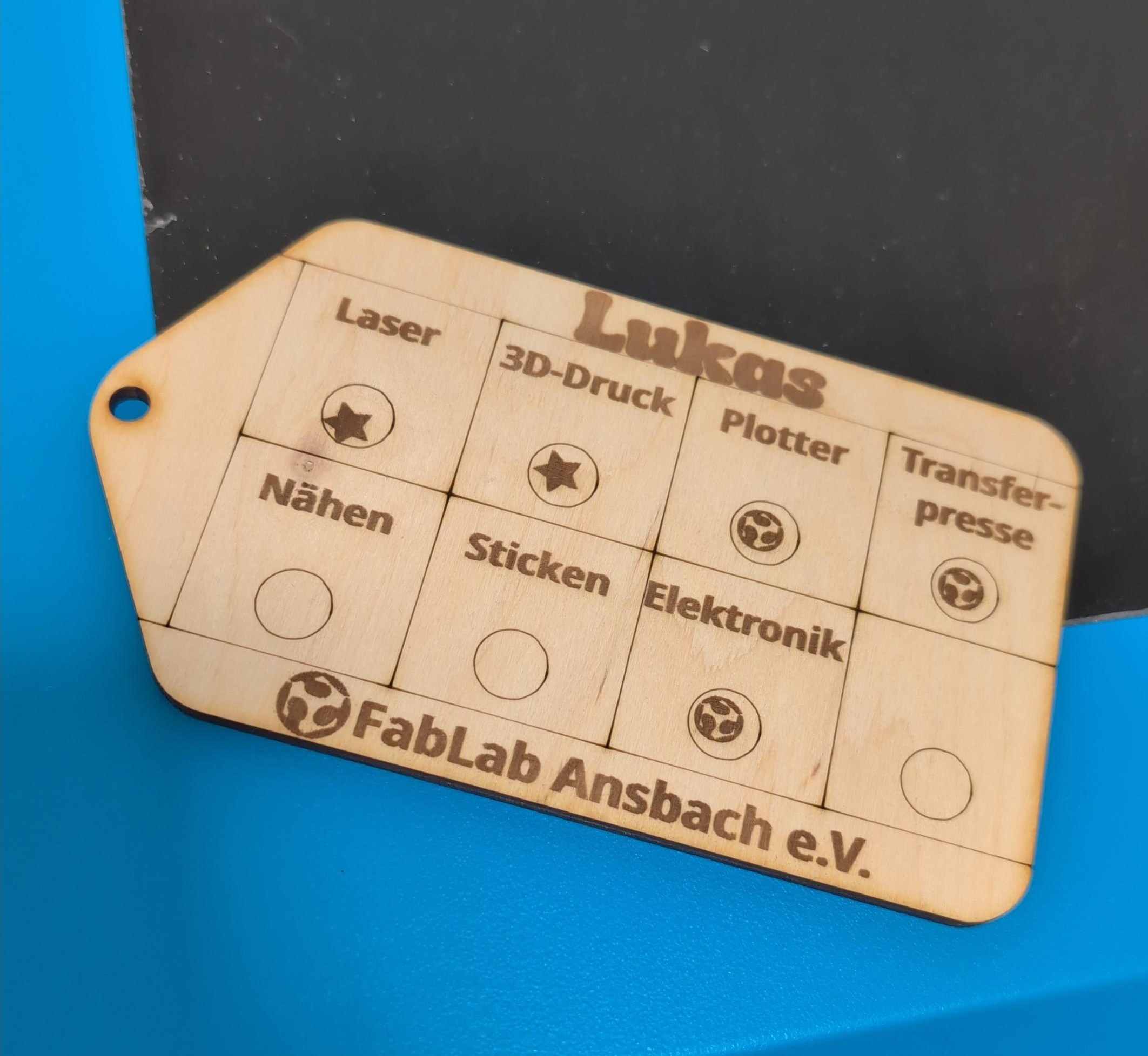 Wir lasern zusammen deinen persönlichen Maschinenausweis. Immer, wenn du eine neue Maschine bedienen kannst darfst du dir einen neuen Stern (oder unser Logo) auf deinen Ausweis lasern!