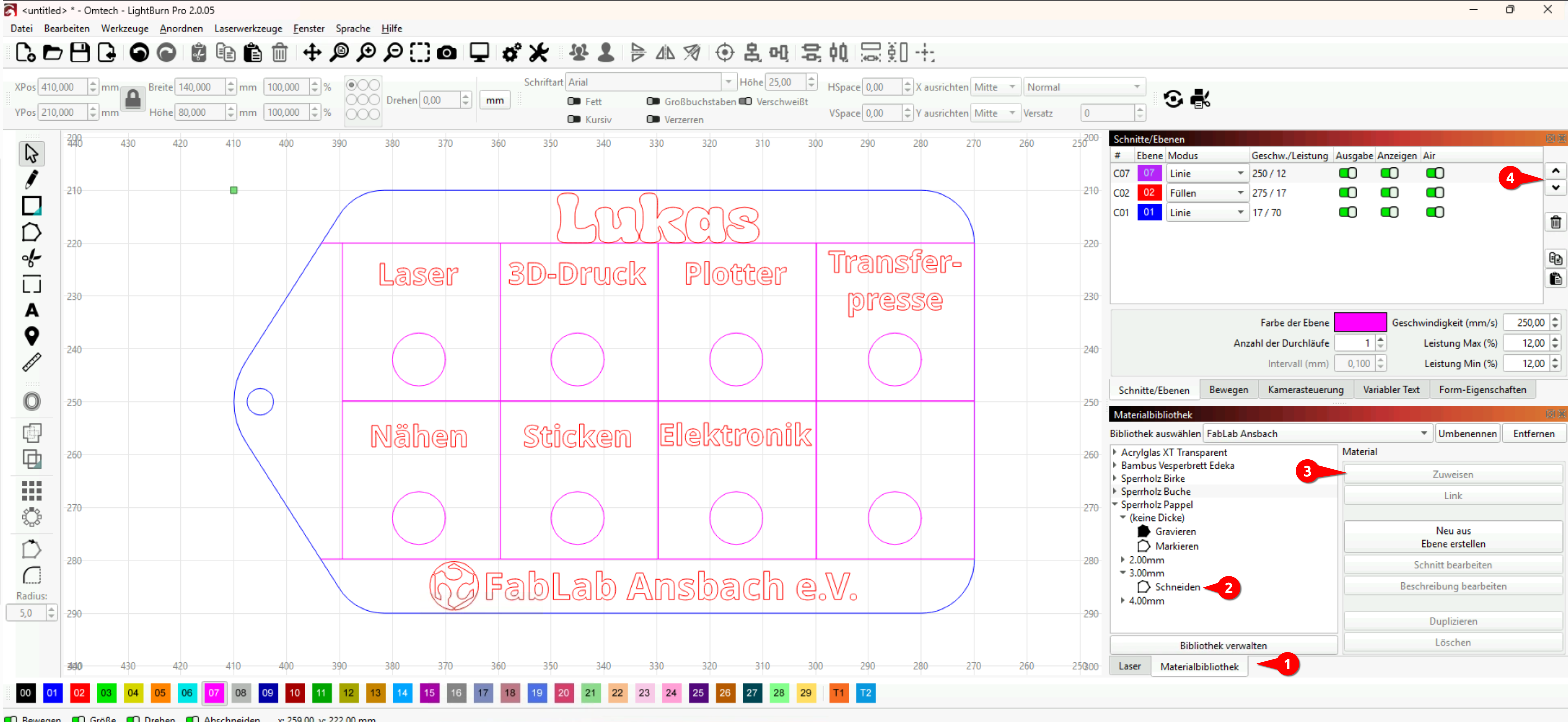 - Ordne die Ebenen jetzt noch richtig an. Als erstes Markieren, dann Gravieren und als letztes Schneiden